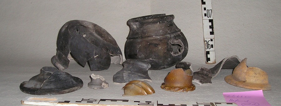 Die gefundene Keramik aus allen Schichten datiert ins 14. bis 15. Jh. Die meisten Scherben stammen von Kugeltöpfen aus hartgebrannter, grauer Irdenware; zwei Töpfe konnten weitgehend aus dem Fundmaterial rekonstruiert werden. Daneben wurden Fragmente von Topfdeckeln gefunden, darunter ein oxidierend gebranntes Exemplar von hellbraun-rötlicher Farbe. Nur zwei Scherben, im Bild vorne in der Mitte, sind Bruchstücke eines Steinzeuggefäßes und vermutlich Importware. Keramik dieser Art wird Siegburger Steinzeug genannt. Meist handelt es sich um schlanke Krüge mit einem Wellenfuß, die etwa ab Mitte des 14. Jh. im Rheinland produziert wurde.
