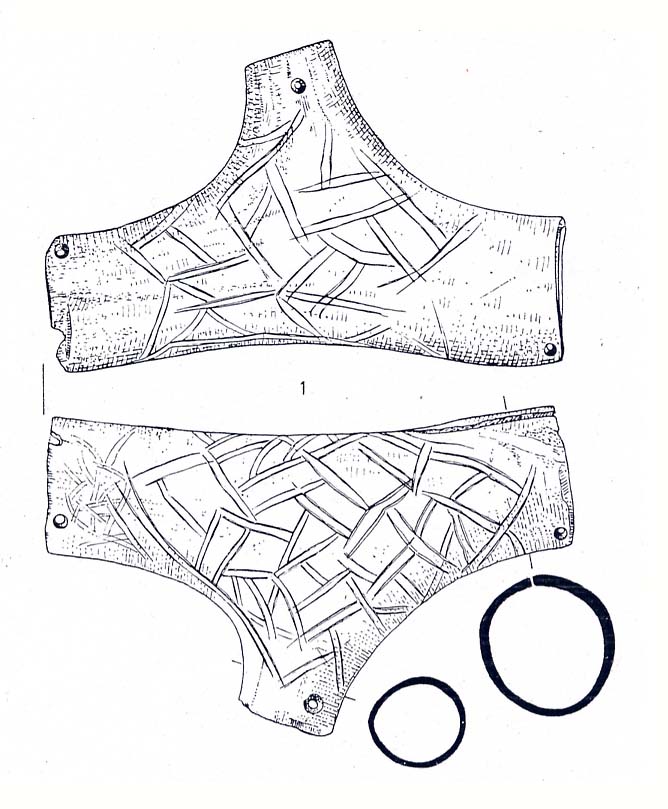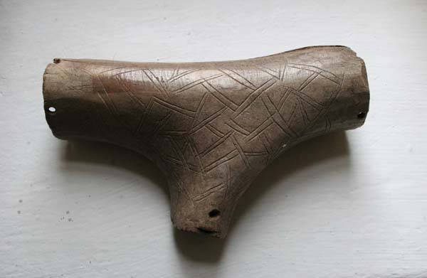 Das Stück wird ins 10.-12. Jh. datiert; ursprünglich wurde es als Riemenverteiler, etwa im Zusammenhang mit einem Pferdezaumzeug, gedeutet. Heute wird es als Behältnis oder Dose interpretiert.