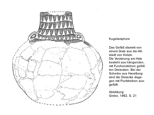 Kugelamphorenkultur zuzurechnen, die etwa im Zeitraum 3100 bis 2700 v. Chr. in Mittel- und Osteuropa auftrat. Die Scherbe ist mit charakteristischen hängenden Dreiecken verziert, die mit punktförmigen Einstichen gefüllt sind. Der Halsbereich der namensgebenden Kugelamphoren ist oft mit solchen Mustern verziert.