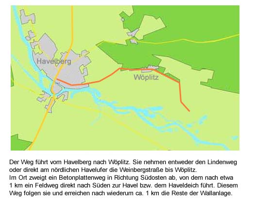 Der Große Burgwall liegt etwa 5 km östlich der Stadt in der Havelniederung auf einer flachen Sandinsel inmitten der sumpfigen Wiesen eines Naturschutz - Gebietes. Eine Wegbeschreibung von Havelberg aus finden sie