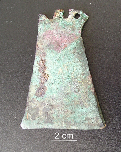 Bronzeblech, das zunächst nicht gedeutet werden konnte, mittlerweile aber von Antje Reichel vom Museum Havelberg als Teil eines Pferdegeschirrs interpretiert wird. Ähnliche Stücke sind aus der römischen Kaiserzeit vom Fundplatz Thorsberg bekannt.
