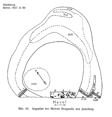 Der Fundplatz liegt ca. 1,5 km ostsüdöstlich von Havelberg in der sumpfigen Niederung direkt an der Havel. Der urspünglich rundliche Wall mit ca. 70 - 80 m Durchmesser ist heute stark erodiert und im Südwestteil durch den Havellauf komplett zerstört.
