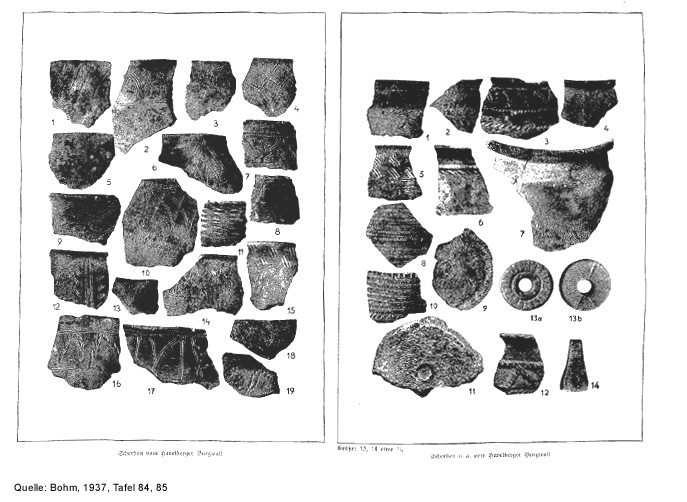 Bei den Grabungen wurden größere Mengen slawischer Keramik gefunden, die überwiegend kammstrichverziert ist, aber auch Grübchen und Kerbreihen trägt. Nur wenige Stücke waren mit Gurtfurchen verziert, einige frühe Kugeltopfscherben wurden gefunden. Eine Auswahl der Funde wurde von Bohm publiziert und ist hier zu sehen.