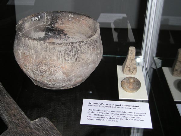 Neben der Keramik konnten ein Wetzstein, ein verzierter Spinnwirtel, ein Bootshaken und Tierknochen geborgen werden. Die Dauerausstellung des Havelberger Museums zeigt einige schöne Fundstücke vom Wallgelände. Aufgrund der Keramik scheint die Anlage vom 9. bis Mitte des 11. Jahrhunderts genutzt worden zu sein. Ein Holzstück aus der Wallkonstruktion konnte durch die Jahresringe datiert werden; es ergab sich ein ungefähres Datum von Mitte des 10. Jahrhunderts für die Errichtung des Walls.