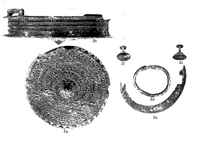 Der Schatz - für die Bronzezeit wird üblicherweise der Begriff "Hort" verwendet - besteht aus einer Dose, in der ein kleiner Armring, die Bruchstücke von zwei größeren Armringen und 38 Zierknöpfe, sogenannte Tutuli, lagen. Der kleine Armring ist aus massiver Bronze mit offenen, übergreifenden Enden. Die größeren Armringe waren ornamentiert. In den Ösen der Tutuli sind noch Lederreste erhalten, die darauf hin deuten, dass die Knöpfchen als Gürtelbesatz dienten.