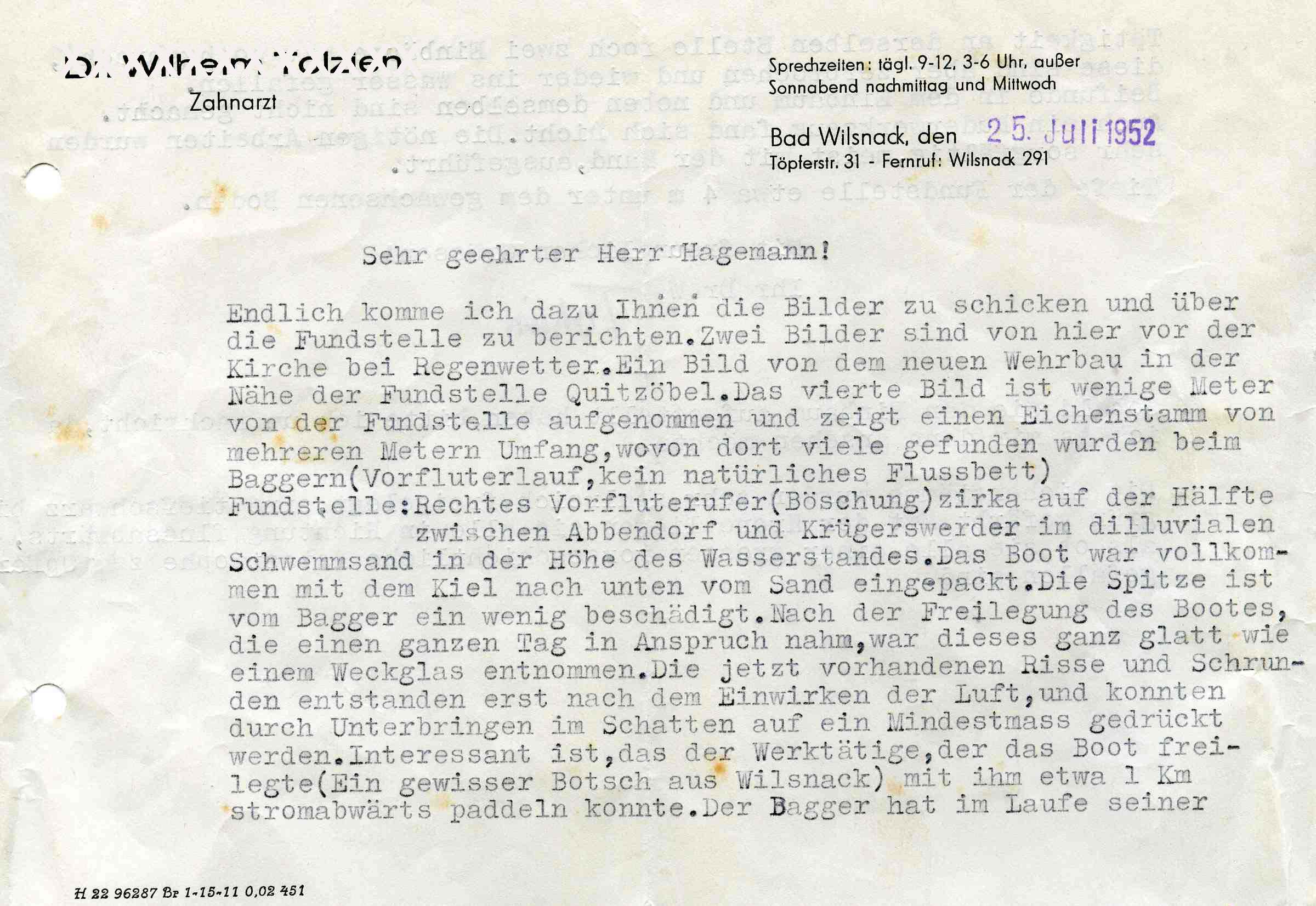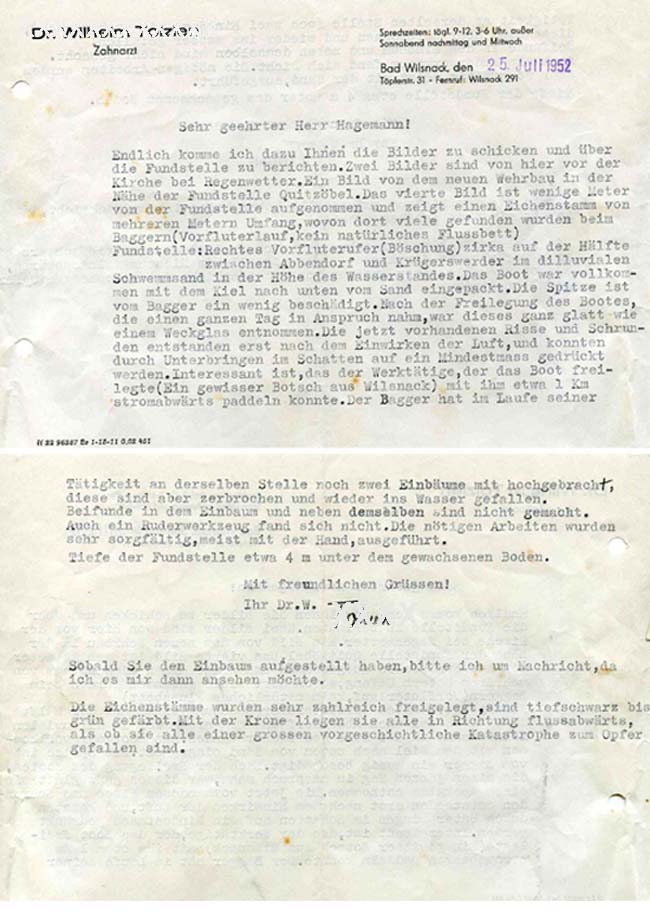 Der Fund und die sorgfältige Bergung wenigstens dieses einen Bootes ist einem Zahnarzt aus Bad Wilsnack zu verdanken, der die Übergabe an das Prignitzmuseum veranlasste. Nebem dem Originalbericht sind auch einige Fotos erhalten.