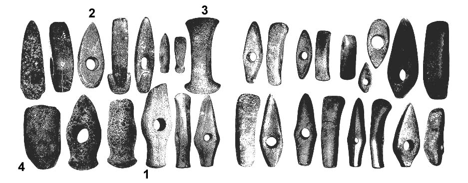 Das 1956 gefundene Exemplar ist hier nicht abgebildet. Die Abbildung stammt leicht verändert aus Bohm, 1937 und zeigt Äxte der Ostprignitz. Aus dem Kreis Havelberg stammen die beiden Äxte 1 und 2. Bei Vehlgast wurde Axt 3 gefunden, eine doppelschneidige Form, bei der Nacken und Schneide nahezu gleich ausgebildet sind. Aus Bad Wilsnack stammt die Axt 4 (Seitenansicht); eine späte Form, die vermutlich schon in den Beginn der Bronzezeit datiert. Der allergrößte Teil dieser Steinäxte wurde (und wird) bei der Feld- oder Gartenarbeit gefunden; genauere Untersuchungen der Fundstellen gibt es kaum.