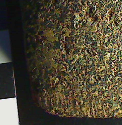 Beile und Äxte sind vermutlich die universellen Werkzeuge im Neolithikum und unabdingbar zum Bau von Siedlungen, zur Herstellung von Holzwerkzeugen und sicher auch Repräsentationsobjekte. Ein zweites Foto aus dem Bereich der Schneide in nicht ganz so hoher Vergrößerung zeigt uns Riefen, die von der Schneide wegführen und eindeutig Arbeitsspuren sind; daneben eine sehr glatte Zone, vermutlich der Rest der ursprünglichen, geschliffenen Oberfläche. Weite Teile sind als Resultat der Nutzung und vermutlich auch einer jahrtausendelangen Verwitterung im Boden bereits recht narbig.