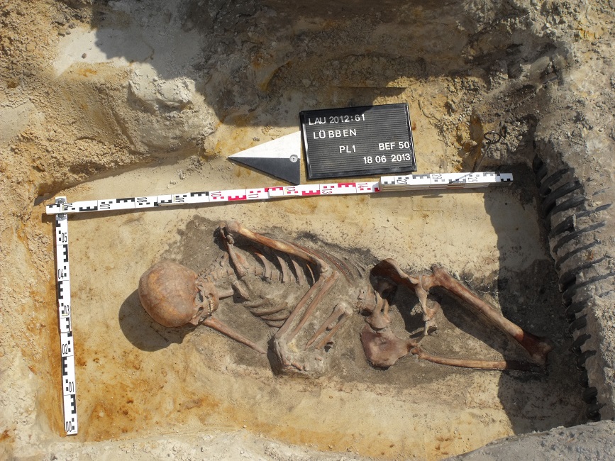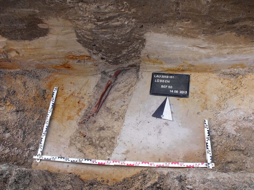 Das Grab aus dem der Schädel links kommt, wurde bei Straßenbauarbeiten in Lübben, einer kleinen Stadt im Spreewald bzw. Südosten Brandenburgs gefunden. Beim Ausbaggern eines Grabens für die künftige Regenentwässerung der Straße, fiel eine recht schmale Grube in der nördlichen Profilwand auf, die noch ca. 70 cm in der Graben reichte. Nur wenige Zentimeter unter der Grabensohle kamen Knochen zum Vorschein, die eindeutig zu einem menschlichen Unterschenkel gehörten (Abbildung 1). Der Bereich wurde dokumentiert, die Knochen geborgen und dann, nach dem die Leitung verlegt war, der nördliche Teil des Grabes freigelegt (Abbildung 2).