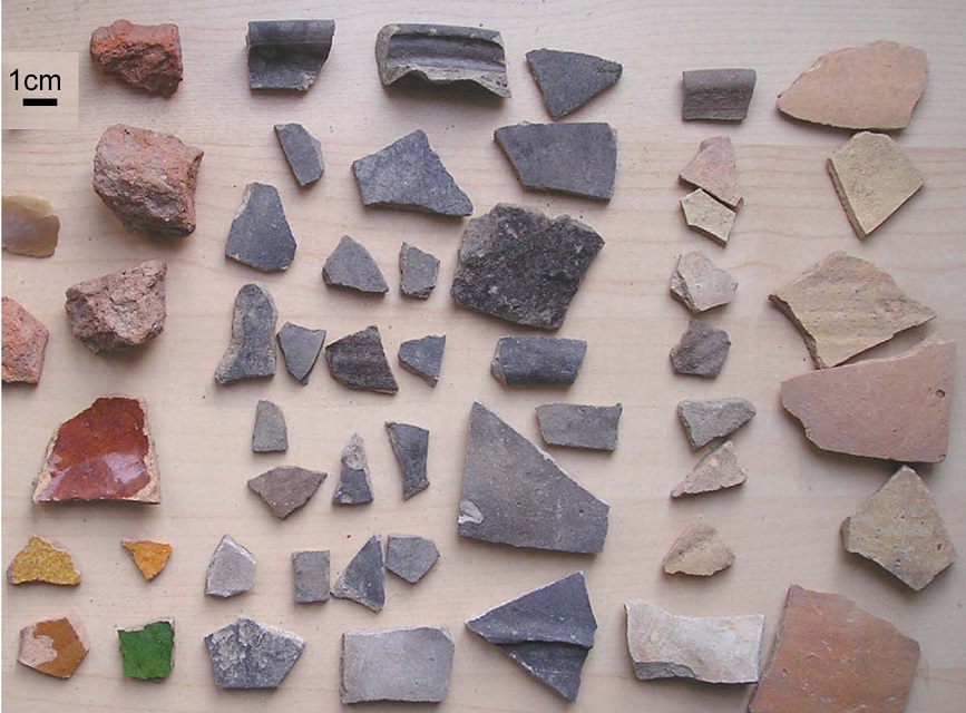 Leider lagen keine Gegenstände in der Grabgrube, die uns den genauen Zeitpunkt der Bestattung oder gar Informationen zum Toten liefern würden. Allerdings wurden aus der Verfüllung etwas über hundert, meist sehr kleine Keramikscherben ausgesiebt, die uns einen Anhaltspunkt geben können. Diese Scherben stammen ursprünglich von der Oberfläche zur Zeit der Beerdigung und gelangten beim Schließen des Grabes z.T. bis auf die Grabsohle. Der größere Teil der Keramik (Abbildung 3) ist hartgebrannte, graue Irdenware des Spätmittelalters, daneben kommt unglasierte helle Irdenware und Faststeinzeug sowie etwas an der Innenseite glasierte Keramik vor. Diese Keramik dürfte aus dem 15. bis evtl. 17. Jh. stammen, Scherben jüngerer Keramik fehlen dagegen völlig.