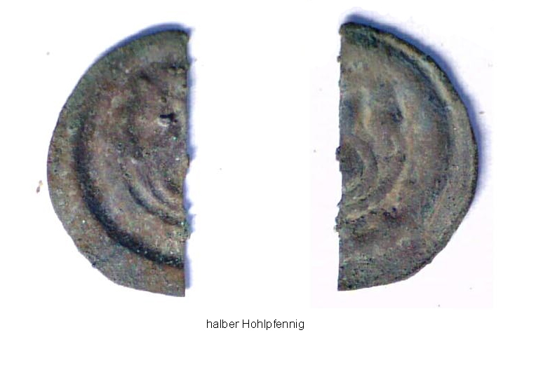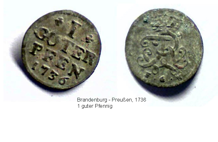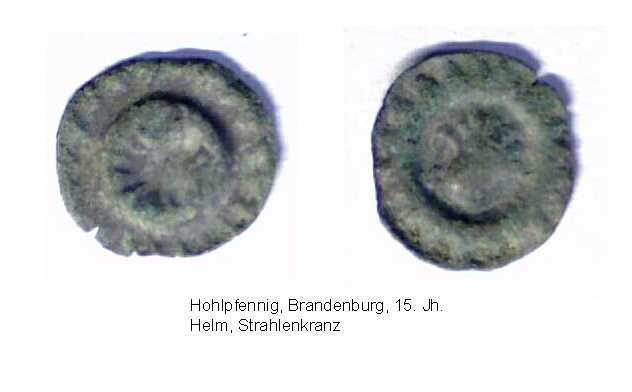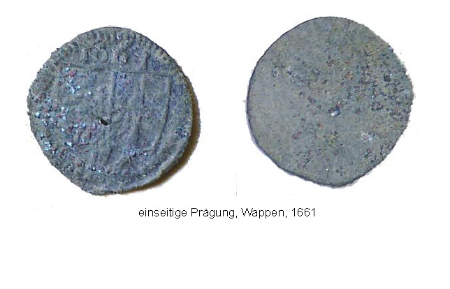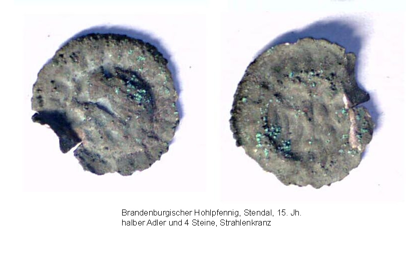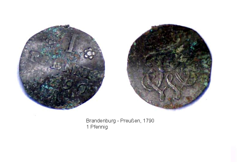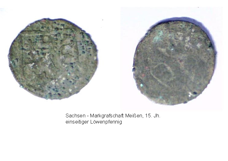 Vierzehn Münzen oder münzähnliche Objekte wurden ausgesiebt, eine weitere Münze (im Bild rechts unten) stammt aus der Schuttverfüllung des Sakristeifundaments. Zusätzlich wurden noch vier Eurocentmünzen aufgefunden, die vermutlich bei der Entnahme des Ziegelbodens verloren gingen. Nach einer vorläufigen und eher laienhaften Bestimmung dürfte die älteste Münze, ein Hohlpfennig aus Erfurt, ins 14. Jh. datieren, dann kommen die brandenburgischen Hohlpfennige des 15. Jh. bis hin zu den preußischen Münzen und einem Pfennig des deutschen Reichs. Das durch die Münzen geöffnete Zeitfenster reicht weit in den Zeitraum eines oder mehrerer Vorgängerbauten zurück.